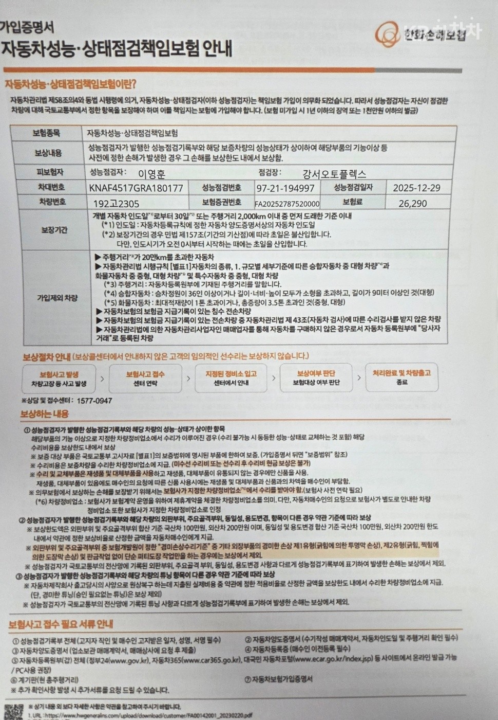 - 자동차 성능상태점검 책임보험(이하 ‘책임보험’라 합니다.)에 가입한 차량