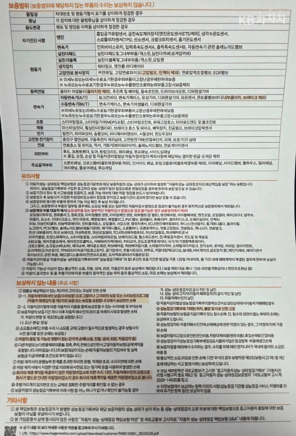 1.상기 보증범위 내 부품의 일부일 경우에도 소모성 부품 또는 일반적인 자동차검사 방법으로 점검기 불가능한 경우 원칙적으로 보증범위에서 제외됩니다.