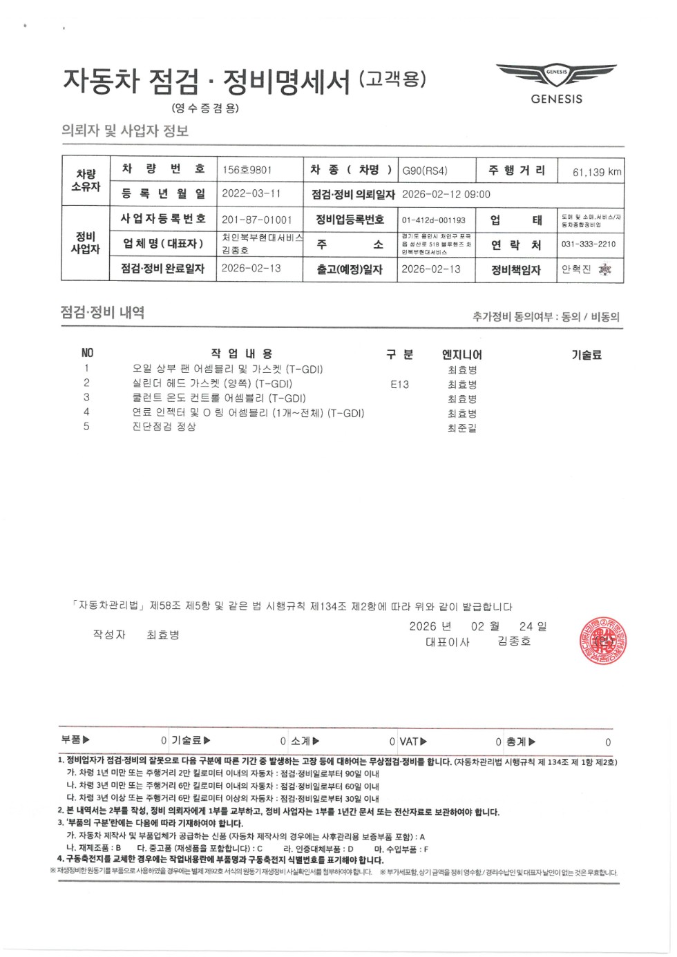 | 엔진 | 흡입공기유량센서,공전속도제어장치[엔진온도센서(ETS)제외],냉각수온도센서,스로틀위치센서(TPS),산소센서,크랭크위치센서,흡기온도센서,실린더헤드및그내부부품(실린터헤드,캠축,흡/배기밸브,밸브스프링,밸브스템씰,HLA)/개스킷,실린더커버(로커암커버),실린더블록및그내부부품(실린더블록,피스톤,피스톤링,커넥팅로드,크랭크샤프트,크랭크축베어링,크랭크케이스)/개스킷,오일팬,워터펌프,엔진룸라디에이터,커먼레일,고압연료파이프(고압펌프,인젝터제외),연료압력조절밸브,EGR밸브 |